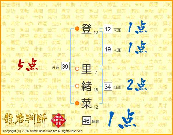 登(12画) 里(7画)緒(15画)菜(12画)