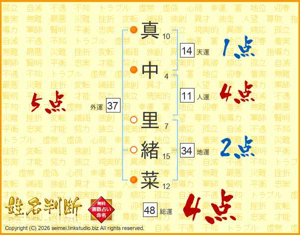 真(10画)中(4画) 里(7画)緒(15画)菜(12画)