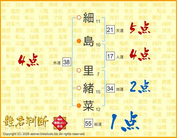 細(11画)島(10画) 里(7画)緒(15画)菜(12画)