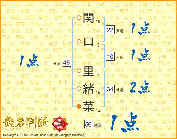 関(19画)口(3画)  里(7画)緒(15画)菜(12画)