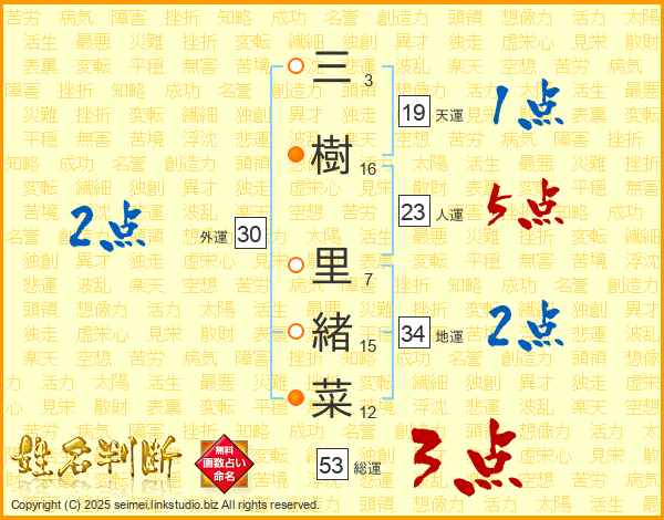 三(3画)樹(16画) 里(7画)緒(15画)菜(12画)