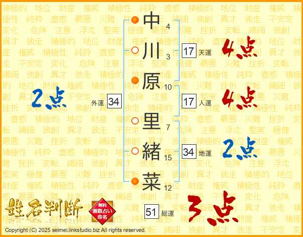 中(4画)川(3画)原(10画) 里(7画)緒(15画)菜(12画)