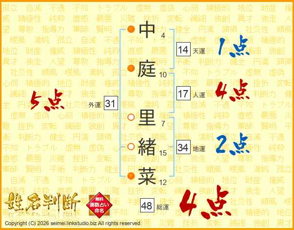 中庭里緒菜さんの総運は48画の4点!