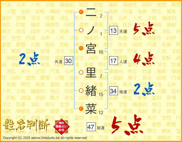 二(2画)ノ(1画)宮(10画) 里(7画)緒(15画)菜(12画)