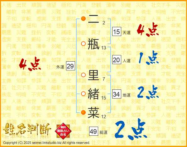 二瓶里緒菜さんの総運は49画の2点!