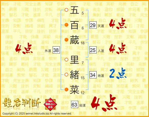 五(5画)百(6画)蔵(18画) 里(7画)緒(15画)菜(12画)