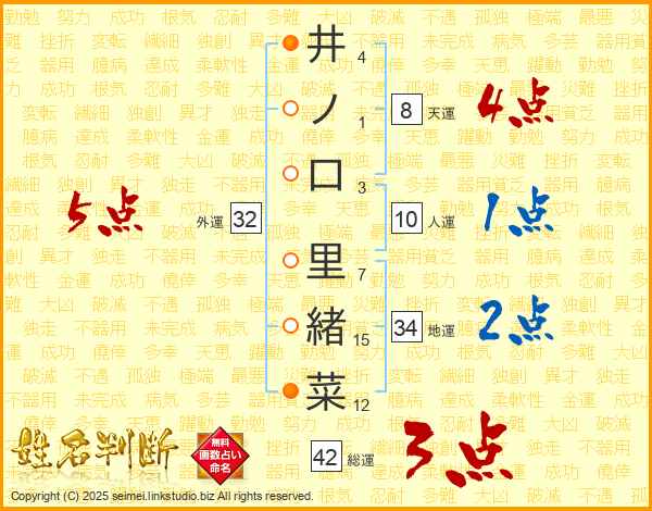 井(4画)ノ(1画)口(3画) 里(7画)緒(15画)菜(12画)