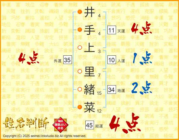 井(4画)手(4画)上(3画) 里(7画)緒(15画)菜(12画)
