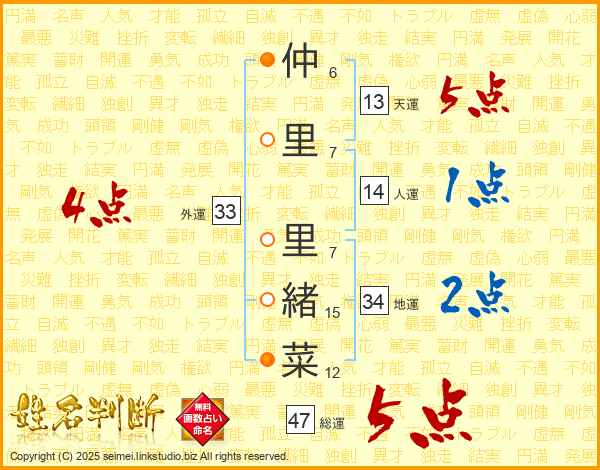 仲里里緒菜さんの総運は47画の5点!
