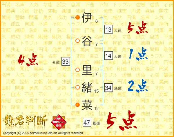 伊(6画)谷(7画)  里(7画)緒(15画)菜(12画)