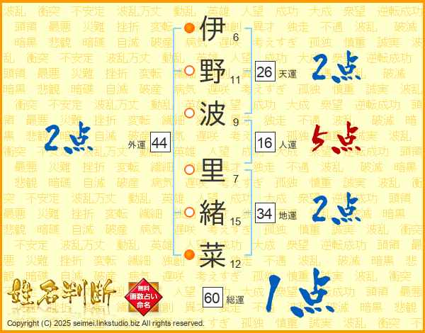 伊(6画)野(11画)波(9画) 里(7画)緒(15画)菜(12画)