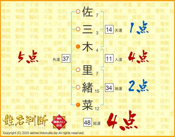 佐(7画)三(3画)木(4画) 里(7画)緒(15画)菜(12画)