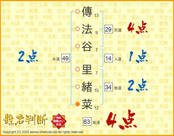 生活面を象徴する運勢です。外部から受ける影響力を表し、結婚運、家庭運や職場、環境への順応性を表します。総運から人運を引いた画数。姓や名が1文字の場合を除く。