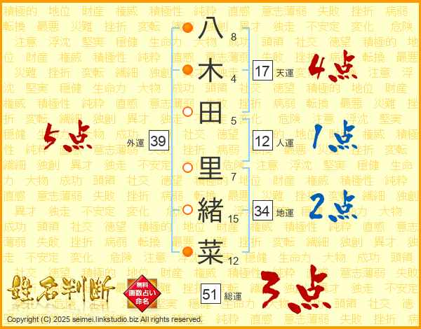 八(8画)木(4画)田(5画) 里(7画)緒(15画)菜(12画)