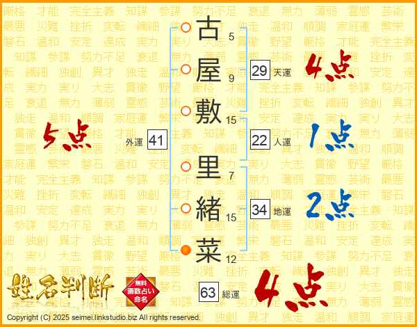 古(5画)屋(9画)敷(15画) 里(7画)緒(15画)菜(12画)