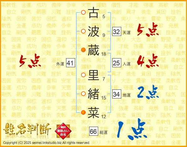 古(5画)波(9画)蔵(18画) 里(7画)緒(15画)菜(12画)