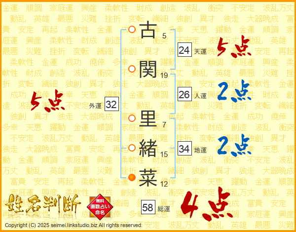 古(5画)関(19画) 里(7画)緒(15画)菜(12画)