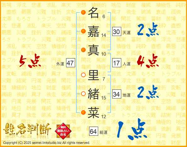 名(6画)嘉(14画)真(10画) 里(7画)緒(15画)菜(12画)