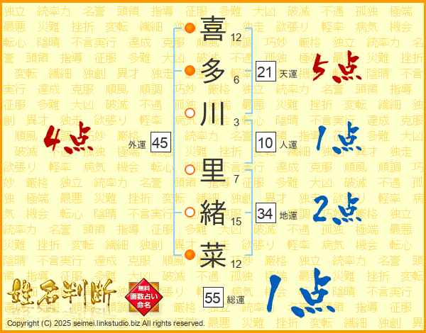 喜多川里緒菜さんの天運は21画の5点!