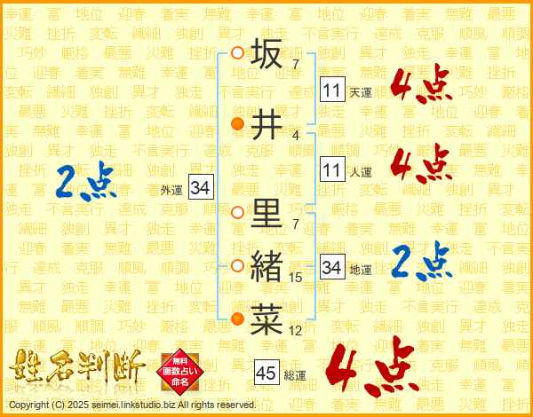 坂(7画)井(4画) 里(7画)緒(15画)菜(12画)