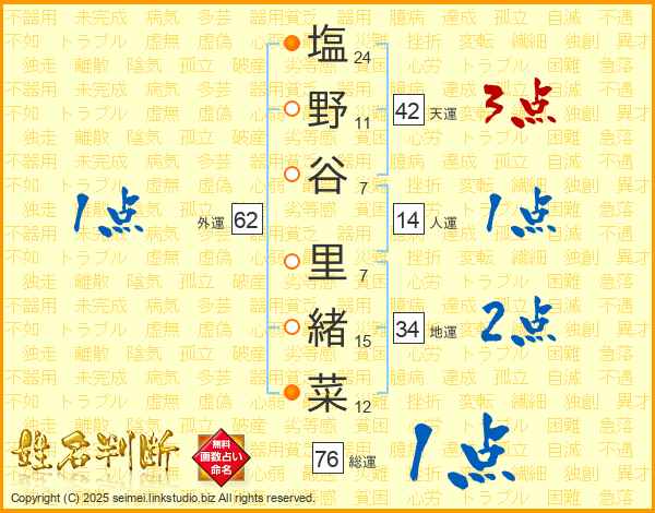 塩(24画)野(11画)谷(7画) 里(7画)緒(15画)菜(12画)