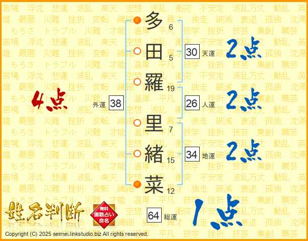 多(6画)田(5画)羅(19画) 里(7画)緒(15画)菜(12画)