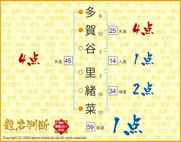 多(6画)賀(12画)谷(7画) 里(7画)緒(15画)菜(12画)