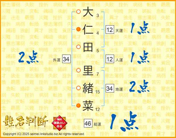 大(3画)仁(4画)田(5画) 里(7画)緒(15画)菜(12画)