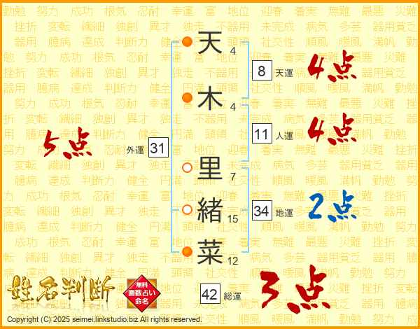 天(4画)木(4画) 里(7画)緒(15画)菜(12画)