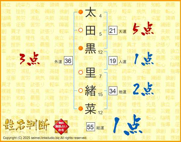 太(4画)田(5画)黒(12画) 里(7画)緒(15画)菜(12画)