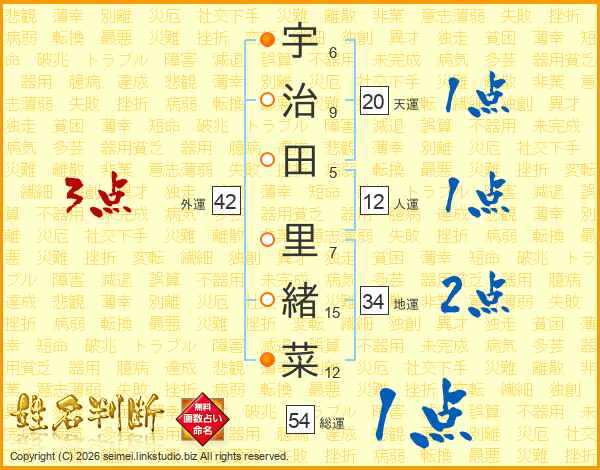 宇(6画)治(9画)田(5画) 里(7画)緒(15画)菜(12画)