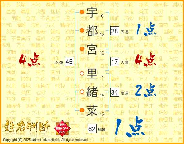 宇(6画)都(12画)宮(10画) 里(7画)緒(15画)菜(12画)