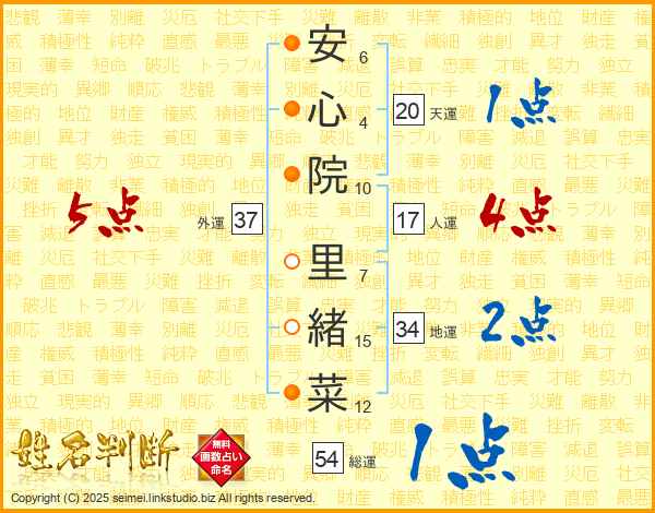 安(6画)心(4画)院(10画) 里(7画)緒(15画)菜(12画)