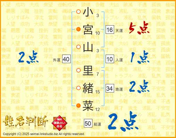 小(3画)宮(10画)山(3画) 里(7画)緒(15画)菜(12画)