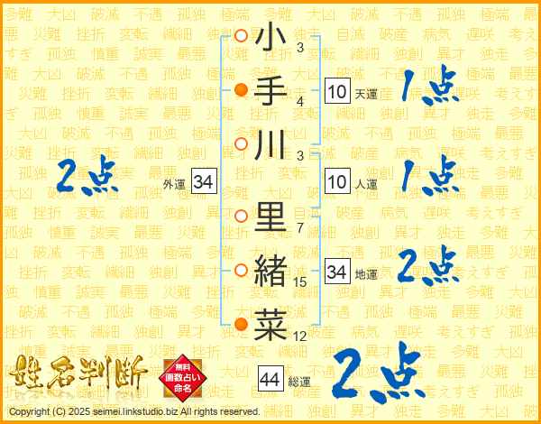 小(3画)手(4画)川(3画) 里(7画)緒(15画)菜(12画)
