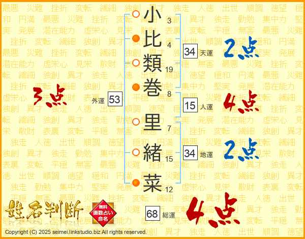 小比類巻里緒菜さんの総運は68画の4点!
