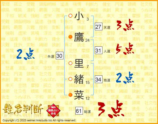 小(3画)鷹(24画) 里(7画)緒(15画)菜(12画)