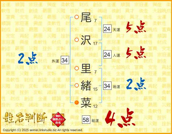 尾(7画)沢(17画) 里(7画)緒(15画)菜(12画)