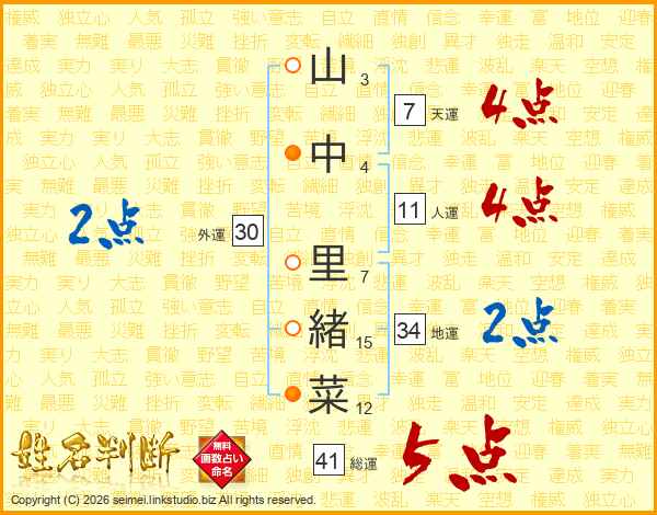 山(3画)中(4画) 里(7画)緒(15画)菜(12画)