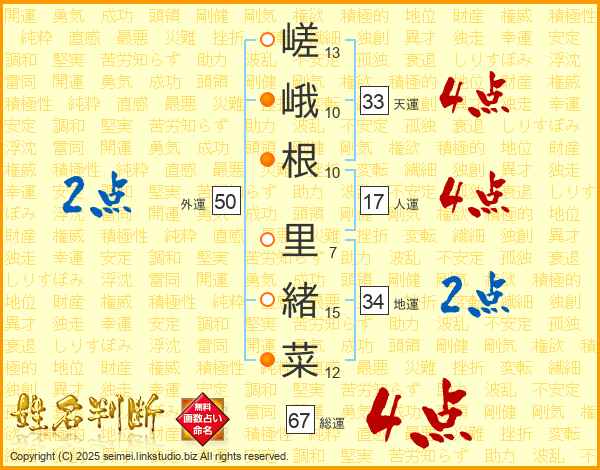 嵯(13画)峨(10画)根(10画) 里(7画)緒(15画)菜(12画)