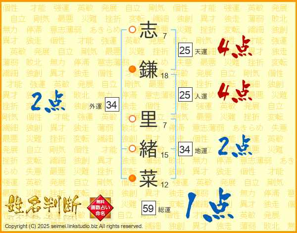 志(7画)鎌(18画) 里(7画)緒(15画)菜(12画)