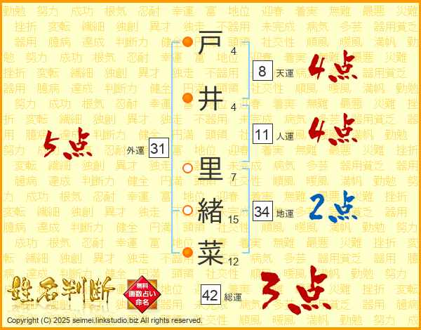 戸(4画)井(4画) 里(7画)緒(15画)菜(12画)