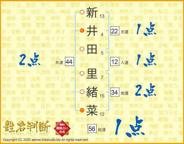 新(13画)井(4画)田(5画) 里(7画)緒(15画)菜(12画)