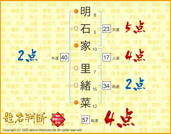明(8画)石(5画)家(10画)  里(7画)緒(15画)菜(12画)