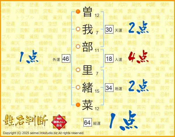 曽(12画)我(7画)部(11画) 里(7画)緒(15画)菜(12画)