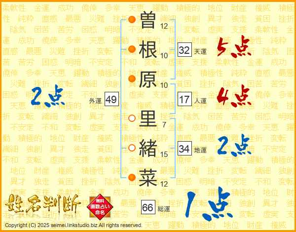 曽(12画)根(10画)原(10画) 里(7画)緒(15画)菜(12画)