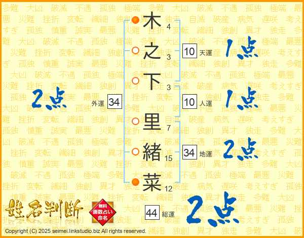木(4画)之(3画)下(3画) 里(7画)緒(15画)菜(12画)