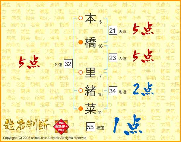 本(5画)橋(16画) 里(7画)緒(15画)菜(12画)
