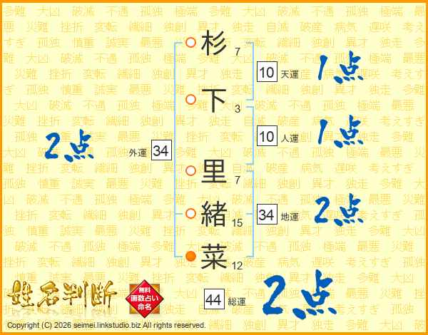杉下里緒菜さんの総運は44画の2点!