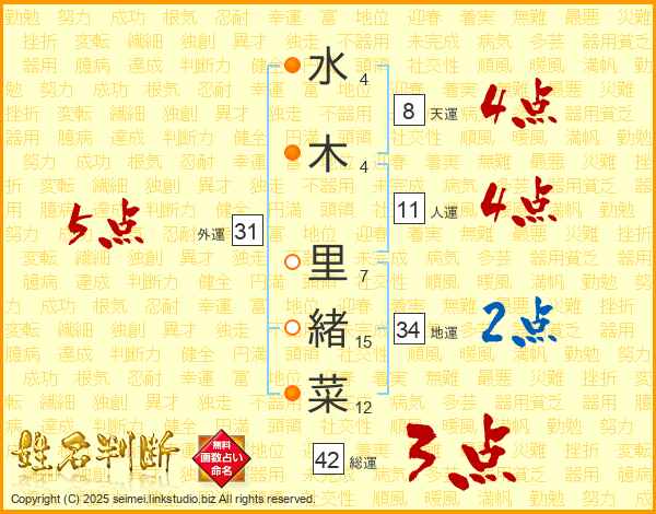 水(4画)木(4画) 里(7画)緒(15画)菜(12画)